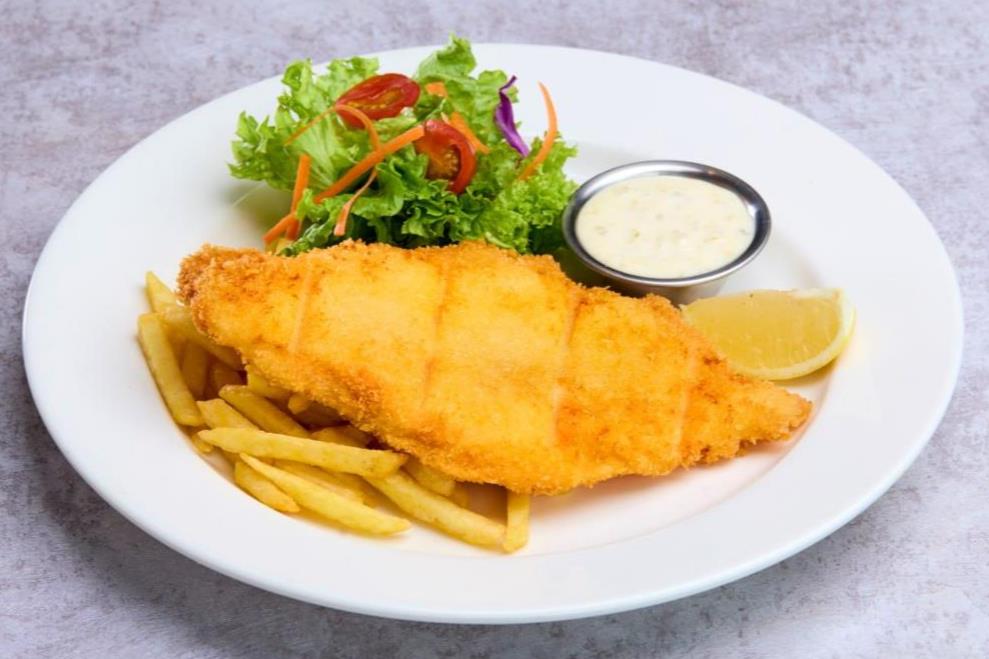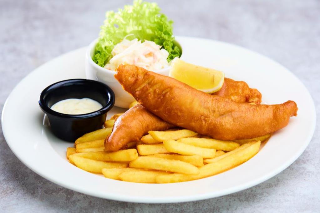 Root Beer battered. Sides: Coleslaw & French Fries.